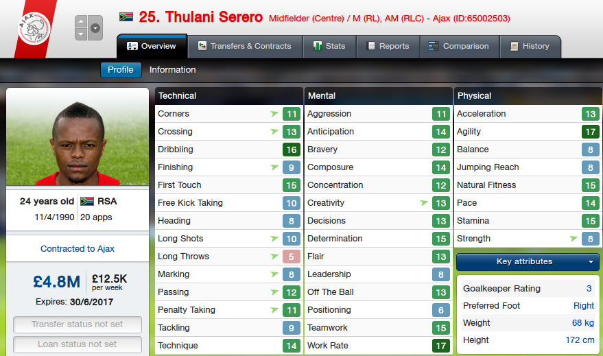 As I intend to play a 4-5-1 formation, I am obviously playing 3 central midfielders each game. There is no doubt over me starting Daley Blind, who is a fantastic player at just 24 years old. Then, it is between Lerin Duarte, who I will sometimes play on the left wing, Christian Poulsen, who will add experience to the first team, Thulani Serero, who I believe will add creativity to the midfield, and Stanislav Lobotka, who definitely has some potential. The probable two choices are going to be Christian Poulsen and Thulani Serero, with Lerin Duarte playing back-up in left wing, although that could definitely change.