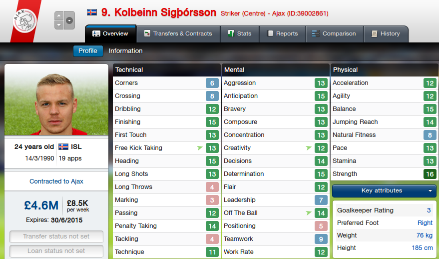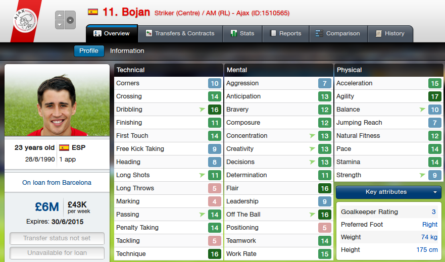 Three top class strikers. Siem de Jong will take the first team position up front, with Bojan perhaps moving to the wings or becoming a first team striker when de Jong is injured. Then, if Bojan plays on the wing and de Jong is injured, Kolbeinn Sigporsson will take the lead up front. I don't need to buy another striker, because the three I have are fantastic.