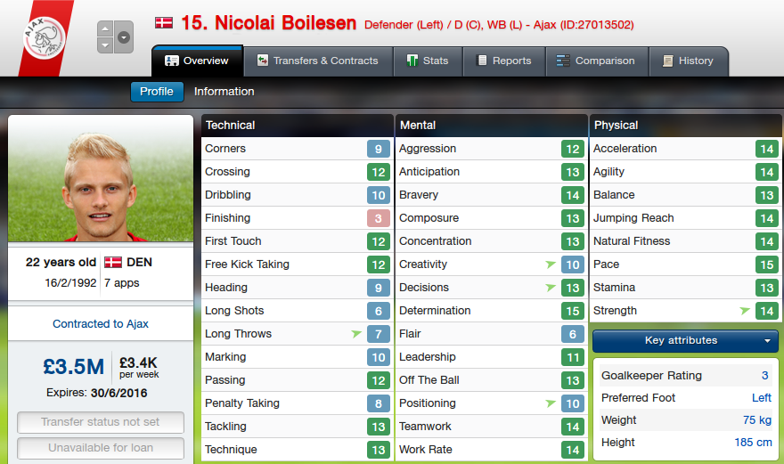 Nicolai Boilesen is a fantastic left back, but he will need some back-up, or even someone to start ahead of him, just because one left back isn't enough for a squad. 22 year old Boilesen still hasn't hit his peak, and until he has, I would like someone with more experience, but Boilesen will become a star in the near future. I will start searching for a left back within the next few days, and won't stop until I've found the perfect left back for the squad.