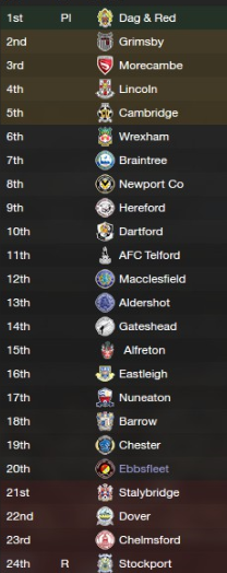Stockport will be up to the Conference in real life soon enough; correct me if I'm wrong but I've heard that they have a bit of money now. 11th last season; County probably have an outside chance to make the playoffs