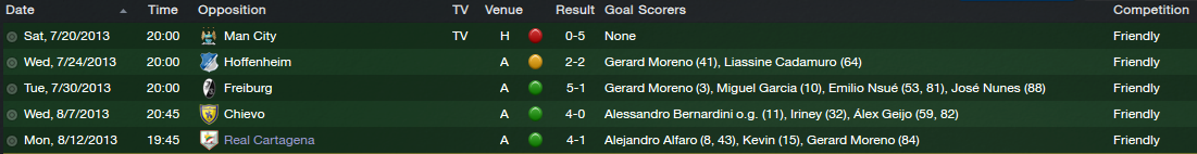 We opened up with a hard loss to Premier League giants Manchester City, which is expected. Striker Sergio Aguero scored four goals for Manchester City, so it was a pretty bad game. Next we took on Hoffenheim, and we fell down quick 2 - nil. However, Gerard Moreno scored a header to get us within reach and then Liassine Cadamuro scored a brilliant free kick to tie it up.