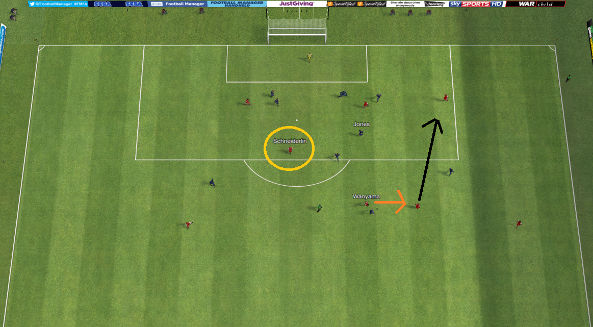 Image #1 - Boruc starts of the play from the back, passing it to the Central defender. The wing players for Manchester United are playing close to our fullbacks, the striker and attacking mid is playing on Wanyama and the DLP(Ward-Prowse) is on the other side of the formation with the B2B player(Schneiderlin) pushing forward. The central defender takes a long pass to the AP on the wing.