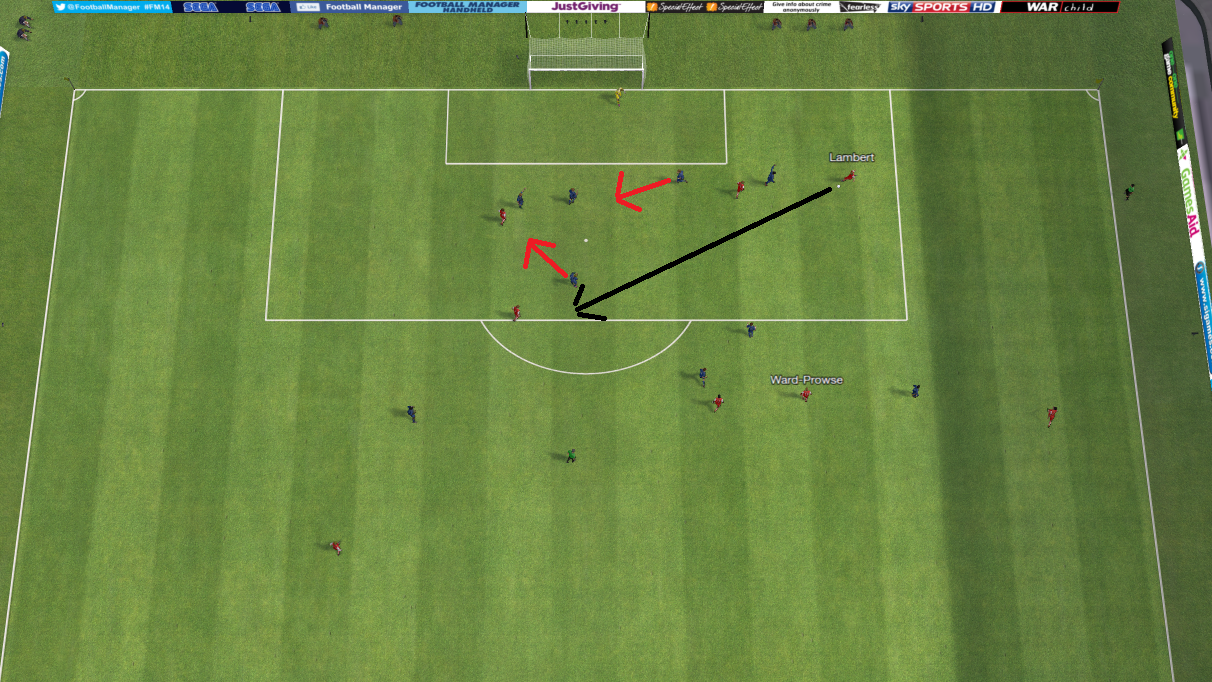 Wanyama easily wins the header and gets it to James Ward Prowse who is sitting on the edge of the box. He will play a ball right back to Lambert who is loads of space. Rodriguez has continually pulled the FB inside from his position and Carrick is sort of lost in the motion. If you notice, this puts the Winger(Valencia) in a contradiction. He can't drop down on Lambert or mark Clyne, what he ends up doing his try to close down Prowse but it's too late.
