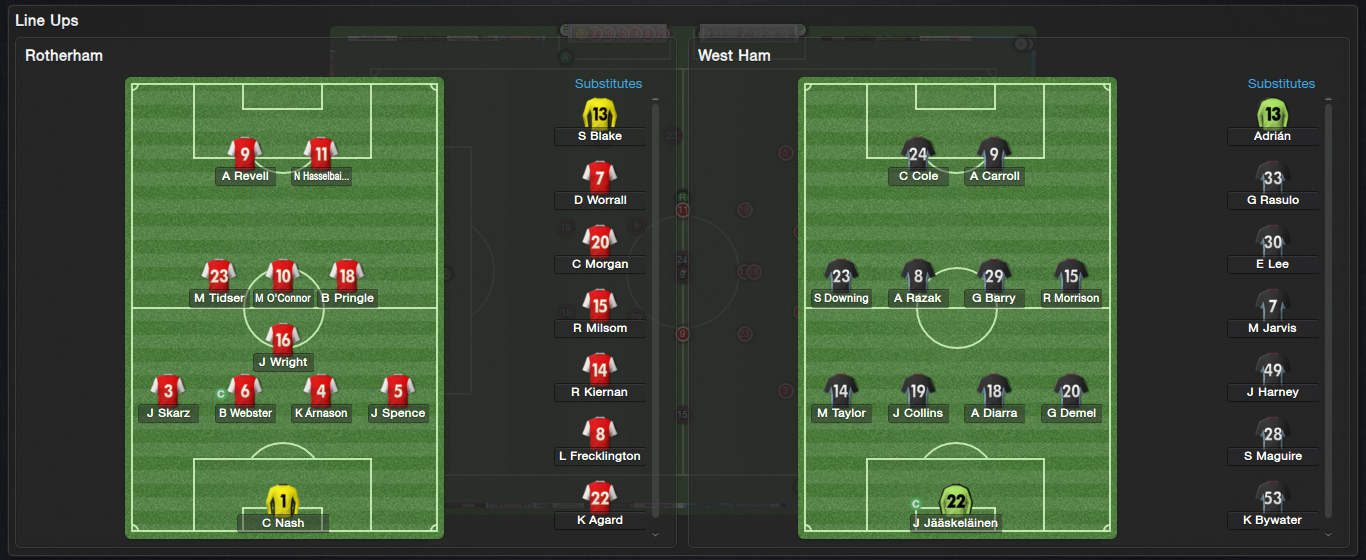 60' The hour gone and nothing much is happening. Rotherham are keeping the ball at the back trying to consolidate their lead but West Ham are pushing more and more men up.