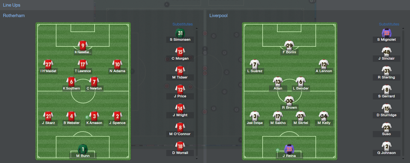 15' GOAL!!! Rotherham 0 - 1 Liverpool. Reece Brown holds up the ball outside the area and finds Suarez who knocks it straight on towards Borini. Borini sprints into the box taking on 2 players and slots it past a stranded Bunn.