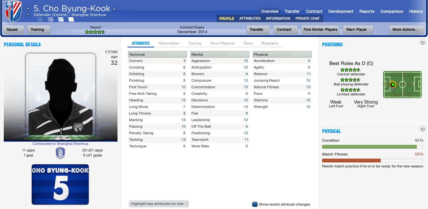 At the back there was 32 year-old Korean, Cho Byung-Kook. This guy would never let anyone past him and looks like a wall at the back. He can keep hold of a striker and pocket any balls that come near him. Although he is very good at keeping close to a striker he is easily done by any pace, being 32 means that he isn't the fastest guy in the world but I don't think that will be a problem in the Jia League.
