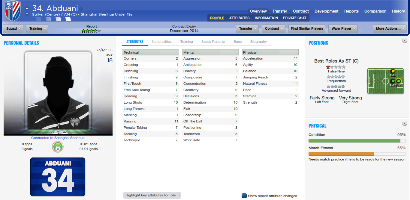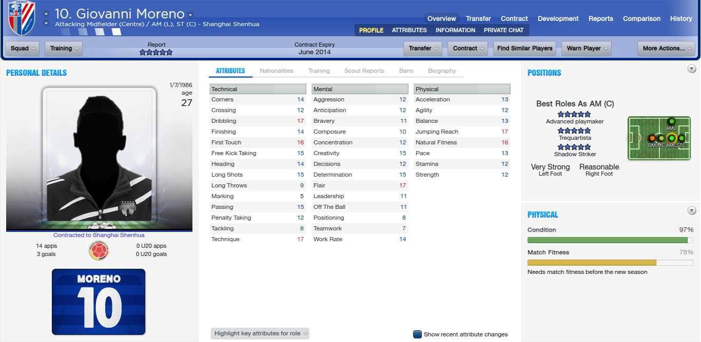 27 year-old Colombian striker, Giovanni Moreno was the first to stand out. He looked to me as the most clinical striker I had. He was incredibly tall and scared defenders trying to mark him. Whenever he was in the box I always believed something was going to happen and 9 times out of 10 he scored. A long with this was his leadership, he was able to get players around him to up their work rate whenever they looked sloppy and players (literally) looked up to him. Giovanni will be my captain.