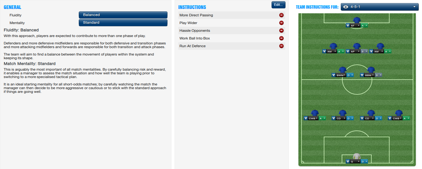I gathered the lads round in the changing room at the end of the day and explained to them the tactics in which I will be using, a narrow 4-2-3-1 with 2 attacking midfielders moving out wide and providing width to any attack, but also able to stay inside and add men to the midfield. We will play quick and direct football and we will try and shoot mainly inside the box. Our 2 wing-backs will try and push up and add cross balls in to Moreno, but will be able to drop back and defend if we have pressure on us.