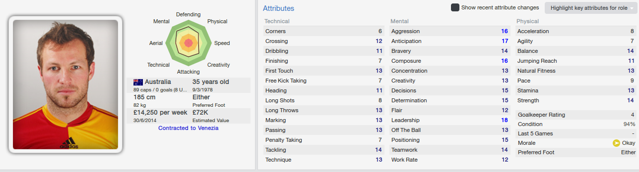 Christian Terlizzi is another old player that signed with our club, but once again, I am very pleased to have a player with such a huge experience at our club! He is 33 years old, but his stats are still impressive...he lacks the speed and agility, but his heading is impressive, he is also a very strong player, an agressive central defender with a very good composure!