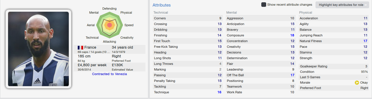 Another signing that I rate 5 stars is our new striker Nikolas Anelka! Anelka is a recordman when it comes to clubs he played for as he played for 11 clubs until now: PSG, Arsenal, Real Madrid, Liverpool, Manchester City, Fenerbahce, Bolton, Chelsea, Shanghai Shenhua, Juventus and WBA!