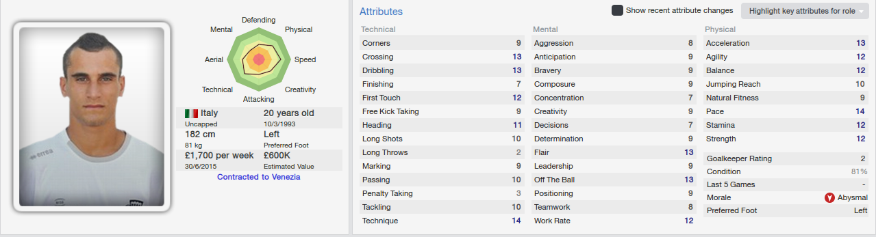 He has some good stats…he is a technique winger, he is a good dribler and I was impressed with his pace. I am rating him 4 stars, as he has huge talen, but he still has to prove himself as a footballer! He can become a good Serie A winger or he can transform into a very poor player…it’s up to him!
