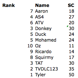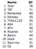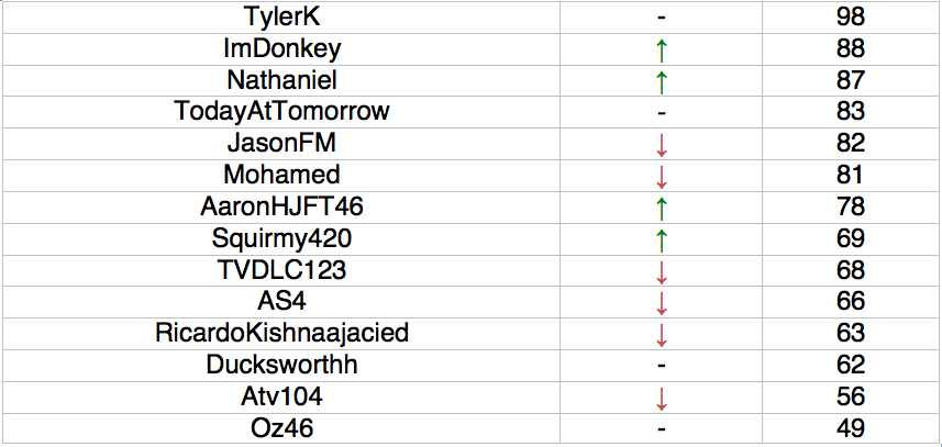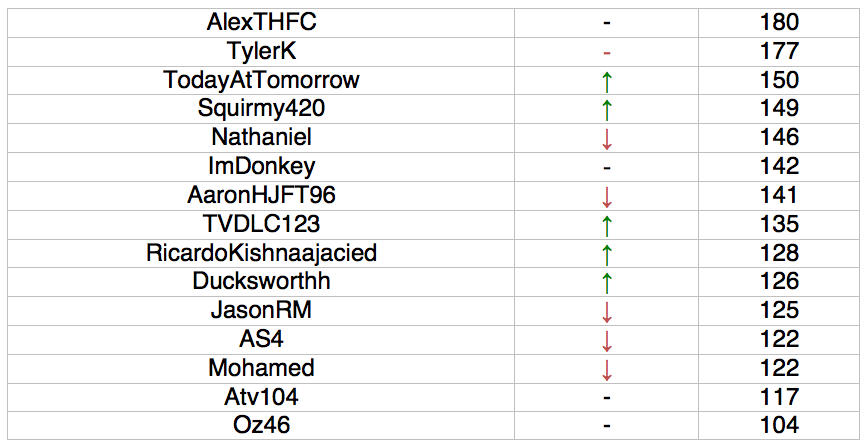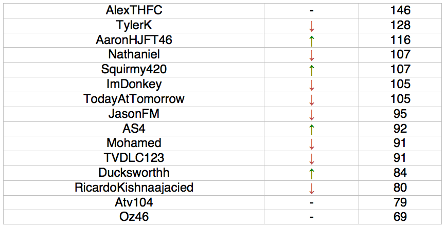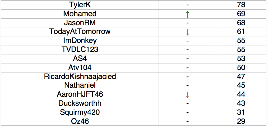 *Nathaniel was meant to be in this competition however, I forgot to add his details, so I've added him in now, he hasn't lost any points, he's just been added to the database.