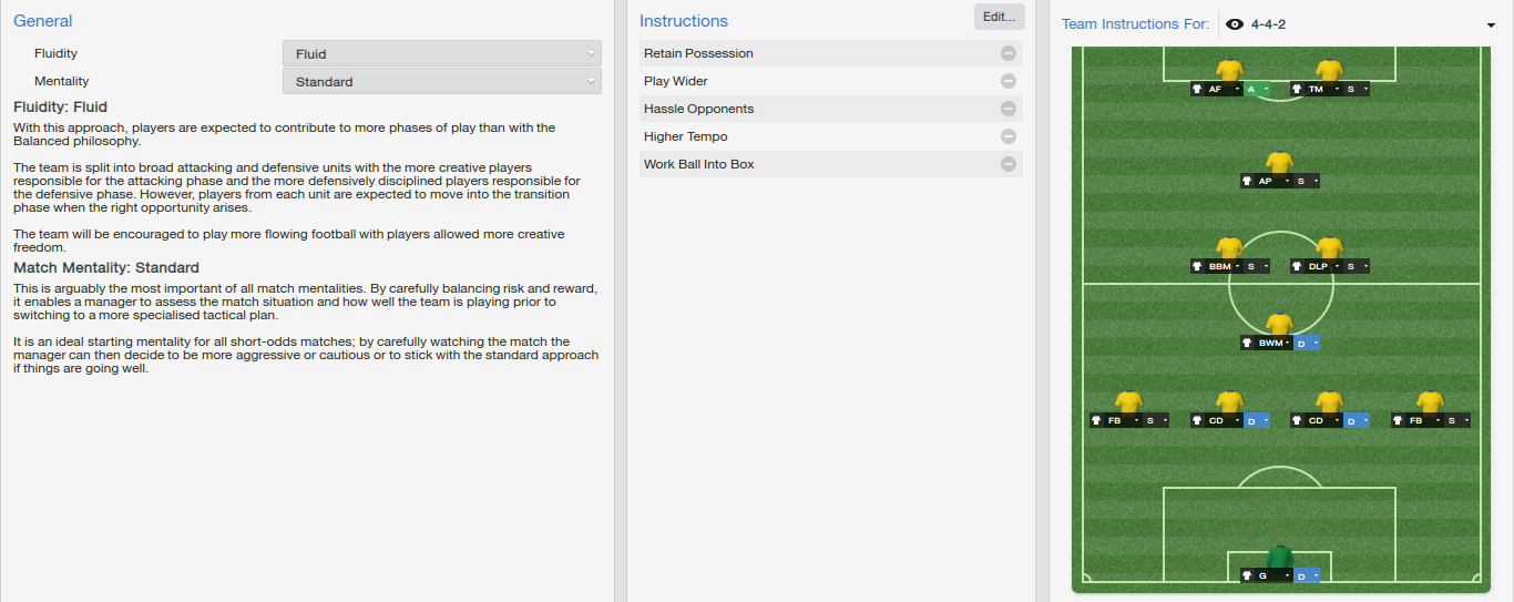 I will play a narrow 4-1-2-1-2 due to, in my opinion, the lack of quality wingers in the league. We also have an abundance of good central midfielders whom I want to get the best out of. Due to the fact we are by far the best team in the league I have decided we shall try and pass the ball around the opposition at a fast tempo, using the two play makers as main creative outputs.