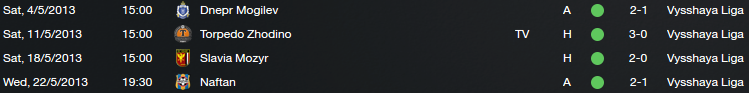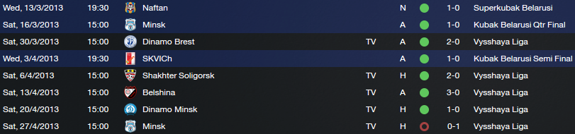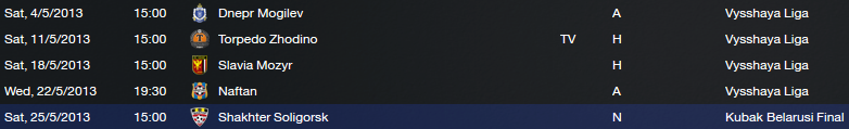 The Kubak Belarusi final is to be played at the end of the month. A good chance for another peice of silverware early in my career, and against a team I have already beat in Shakhter Soligorsk. Our hardest league game this up-and-coming month will probably be against Torpedo Zhodino, although I expect us to win them all and collect maximum points out of May.