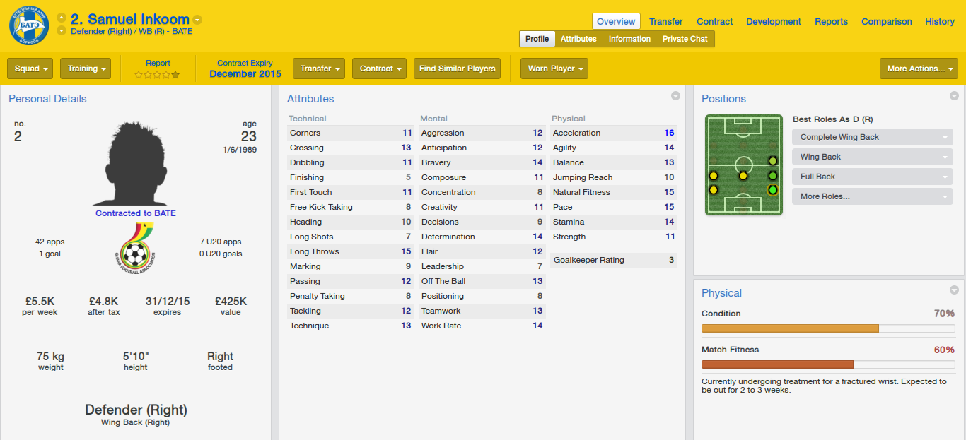 After this had died down I decided I needed a new, young right-back who can offer competition. After looking around at a list of 3 or 4 players I decided to book out a flight to Dnipropetrovsk to hold talks with Dnipro over Ghanaian International Samuel Inkoom. Dnipro held me to tough negotiations and I ended up paying £700k. This was far more than I wanted to spend and also left me with no transfer kitty for the last position that I thought needed to be improved. After much thought I decided to hand a contract to Croat striker Ivan Klasnic.