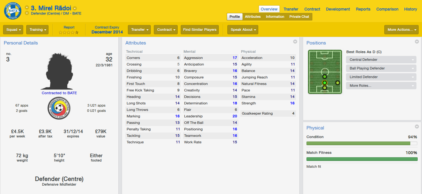 After Andrey's paperwork had gone through and he left for Russia I decided to lock down my squad and start looking towards Incoming transfers. First off I addressed my need for a good quality Centre-Back so I decided to snap up Romanian International Mirel Radoi, whom was released last season by Al-Ain, who play in the UAE. Contract negotiations went through quickly and was handed the number 3 shirt and announced to the BATE fans who were ecstatic by the signing.