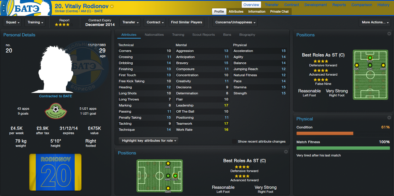 Being the top team in a country means having the best squad, this I believe we have. My captain Vitaliy Rodionov and his vice-captain will be Alexandr Volod'ko. Rodionov has shown me, in the time that I have been at the club, that he is a born leader, however he lacks a bit of motivation and determination to succeed and this will need to improve. Volod'ko is a player that the youngsters look up to as he is one of our better players. He has a reserved personality and never steps out of line.