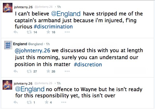 In the tweets JT makes the alarming claim that his feud with the England manager isn't over after suggesting that the newly appointed captain, Rooney, isn't ready to take the lead yet. Despite the England camp warning Terry to show some discretion it looks as if the former skipper wants to carry on this very public debate.