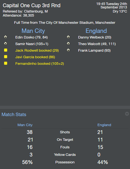 There was some real fire in the City team at the start of the second half of extra time, and combined with some slow and patient build up play in the midfield it was more than England could handle. Within the space of a minute Dzeko had unleashed a shot that the England keeper could only parry into the path of Nasri who, despite a desperate lunge by Clyne, couldn't fail to put into the back of the net past a, yet again, sprawled Hart.