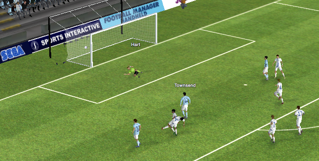 There followed a series of attacks by Man City and each time they came forward the attempted finish came closer to finding the mark. A clear chance by Townsend was only denied by a great save from Hart which pushed the ball onto the post and out for a corner.