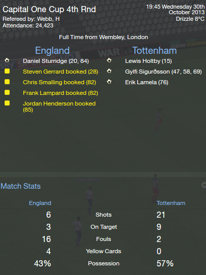 And that was that. England FC dumped out of the Capital One cup by Spurs. While most pegged the match as a close one it was certainly unexpected that the gulf would be so large by the final whistle. A thoroughly deserved win for Tottenham sees them safely into the quarters while Alan Shearer and his boys will have to head back north licking their wounds and wondering how they got it so wrong!