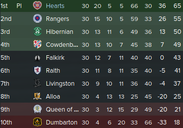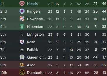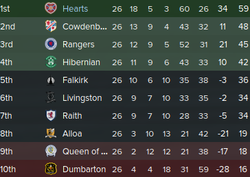 Hearts are now cruising at the top of the table, 5 points ahead of Rangers and Cowdenbeath with a game in hand on both. Hearts fans will probably be celebrating at least making the play-offs soon as they hit 16 points ahead Livingston in 5th, having a game in hand with them also.