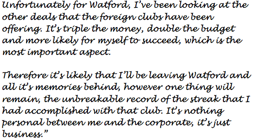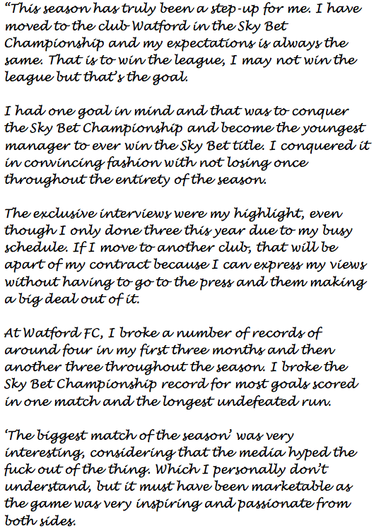 "I have conquered the Sky Bet Championship. At the age of 29, I am now the youngest Sky Bet Champion (as a manager) in the history at football. A lot of foreign teams are knocking on my door, so we could see my services go abroad if the Watford corporates don't put there hand in there pocket."
