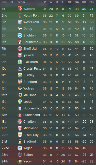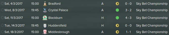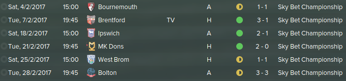 Following the epic clashes of January, we resume to the ordinary fixtures such as against mediocre teams such as MK Dons and Ipswich. First of, we drew against Bournemouth 1-1 in the league. Brentford was televised however the pressure didn't get to us as much as should of and we walked out with a 3-1 win. Facing a middle-table team Ipswich defeating them 2-1 and then facing another MK Dons, soundly defeating them 2-0. Probably the most important match was against West Brom, the reason why is because West Brom is 3rd and pushing for promotion, they just sacked there manager David Moyes, we were the first team they faced without him drawing 1-1. Bolton we drew 3-3 on the last day of February.