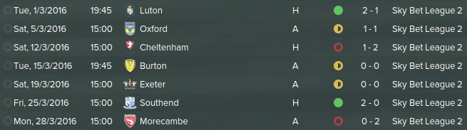 Facing Luton at Kingfield Stadium edging them in a close 2-1 bout. We drew against Oxford away from home at 1-1. Kingfield Stadium was packed to watch us lose 2-1 with us losing a 1-0 lead. Burton and Exeter in both bore draws 0-0. Against Southend we confidentally defeated them 2-0 at Kingfield Stadium. In an important match, Morecambe swiped us down and we lost 2-0 losing our automatic promotion spot.