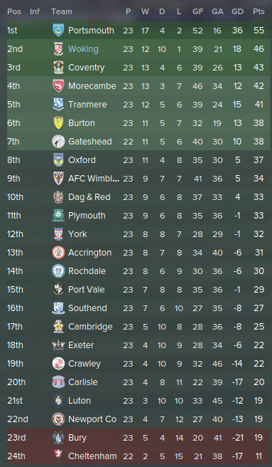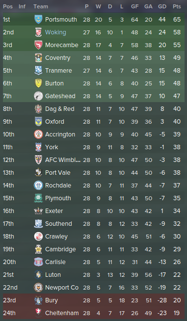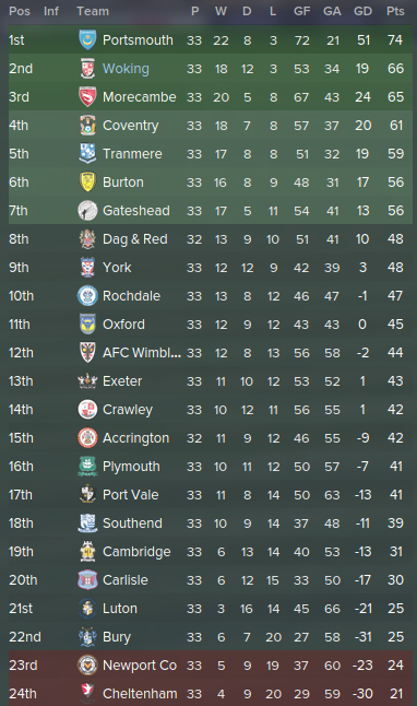 "This is what I was expected would happen. We would dominate the league in the first two thirds and get complacent, throw away hopes of promotion. This squad has lost it's passion and the fans are getting fustrated with them two. Who's to blame? Me, the manager. They got paid 40% more after the financial turnover while I got a 0% increase. They aren't performing as well as they should for that amount of money at this level. If they don't start playing well now, then they will go at the transfer window and I'll bring players in..."