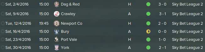 Dagenham Redbridge was demolished 3-0 by us in Kingfield Stadium. We defeated Crawley 3-1 away from home and continued our form by defeating Newport Co 2-0. A bore draw as the only time we didn't claim all 3 points this month against Bury at a 0-0 bout. Faced Port Vale 1-0 at Kingfield Stadium, York City fell victim to us in the final game of the season 2-1.