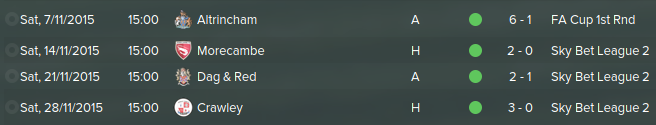"This month has been fantastic, we have won all of our games, but we only had 3 games in the league, which is obviously the priority. The FA Cup, who gives a shit when you're a league 2 team? I'm not expecting to get past the third round. Tactically, I feel we could have broken down Dagenham better, but that's not the players fault, it's my fault. They were playing an odd formation of 5-2-3, hard to defend against and hard to attack. I should perhaps consider my own formation..."