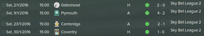 Woking took on Gateshead and defeated them the day after New Years 2-0 in a convincing win at Kingfield Stadium. Scoring goals looked easy against Plymouth as we could have won 7-2 but instead the woodwork was our enemy and denied us to a 4-2 win. Cambridge fell to us 2-1. Edging Coventry was nail-biting to watch as we beat them 1-0.