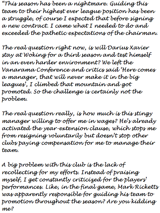 "This month just shows how stupid and undeserving these players actually are. As soon as the finance crew boost up their wages because they have spare money, they start playing like shit. Just typical in modern football, a bit of money and that's it. The only decent player who has been playing with passion is Josh Goddard and I'm happy with his performances recently. I'm just royally pissed off that these average players are getting royalty cheques, yet the true architect is me. I will be considering other jobs after this season..."