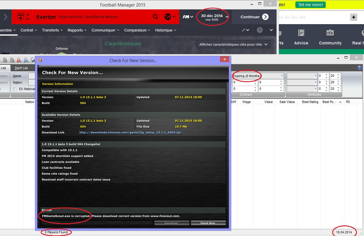 2014-11-11 21:21#199262 gorescu : Same date bug here...the date from FM 2015 game is 01 nov 2014...date from Genie Scout is 18.02.2014...please Eugene fix it.