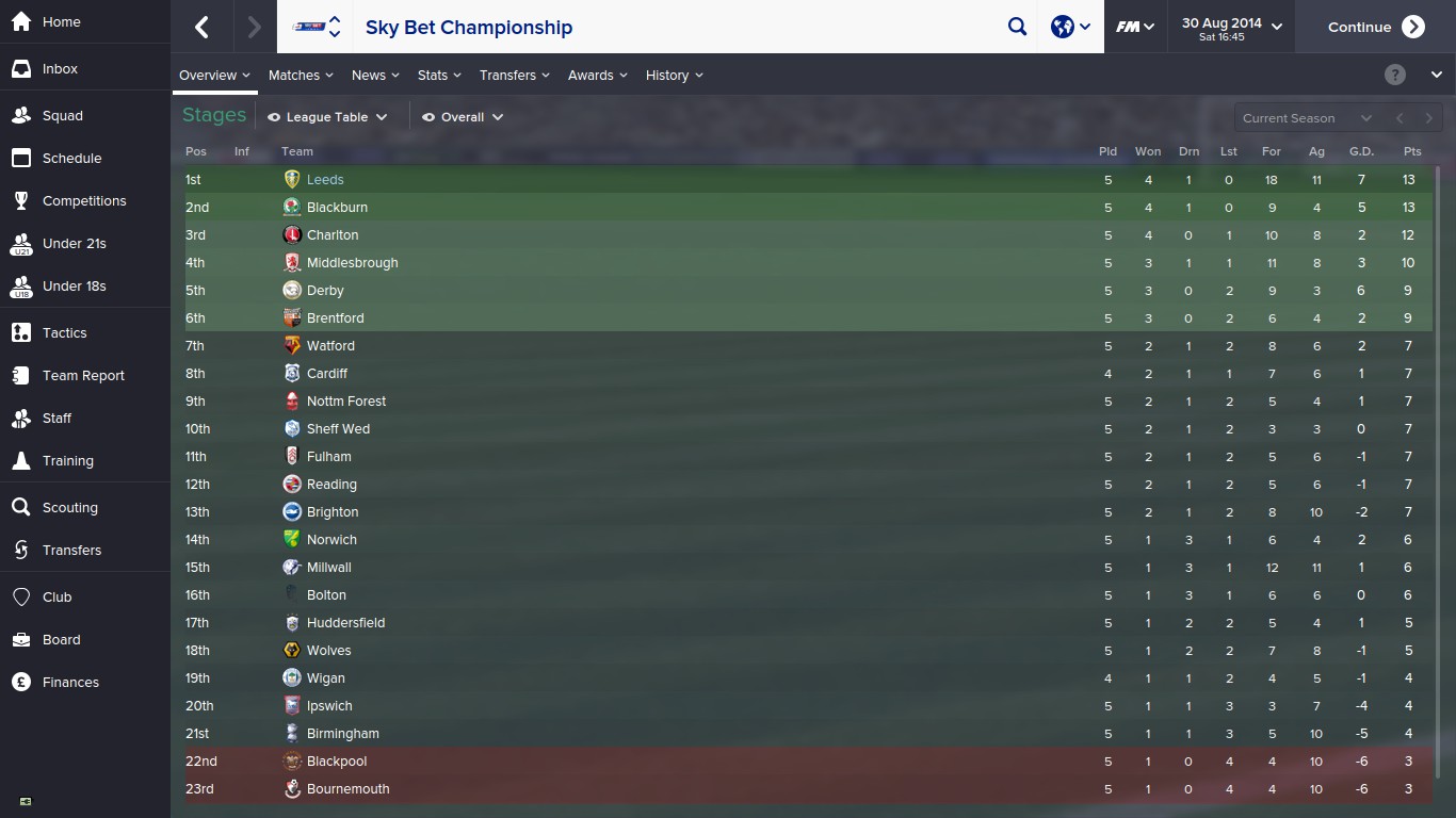 An impressive August sees Leeds sitting pretty at the top of the table with 13 points from their first 5 games. They are also quite rightly the top scorers in the division with 18, however poor defending in the first few games has hindered their progress on goal difference,meaning they also have one of the leakiest defences in the league.