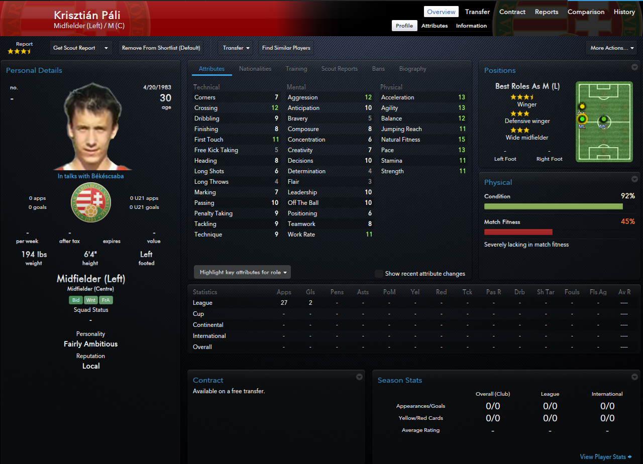 30 year old Hungarian left winger Krisztian Pali has signed with Bekescsaba. With their lack of a true left midfielder, they needed to sign one, and Pali looks to be a decent bargain option.