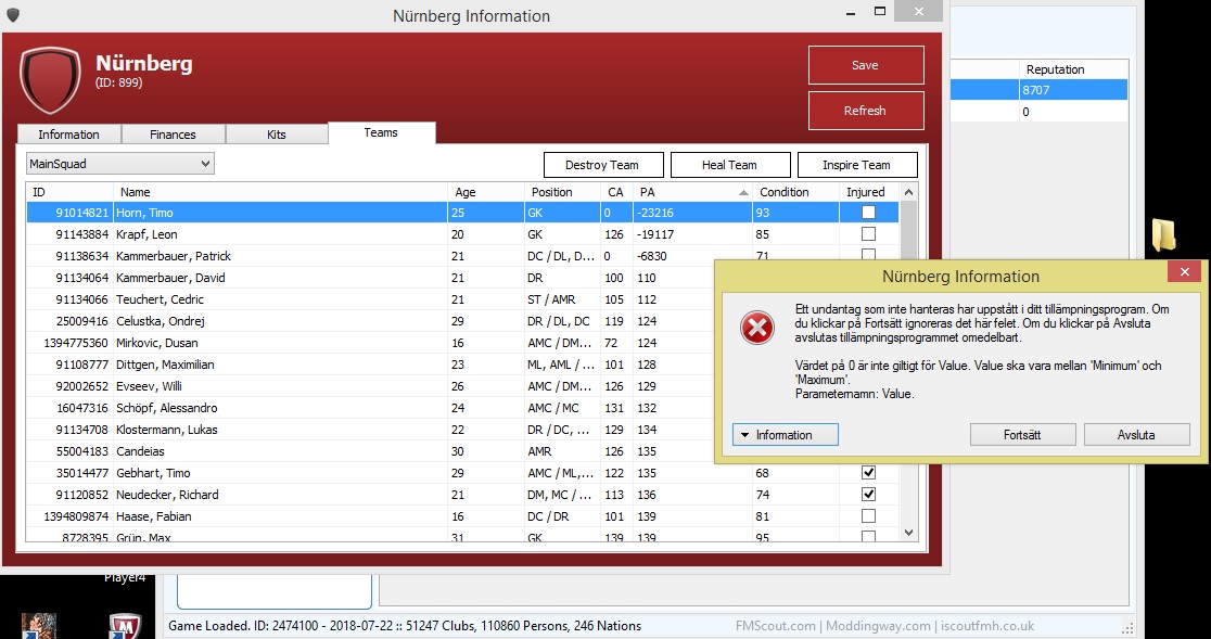 I have a problem, after signing Timo Horn from Köln to FC Nürnberg his stats got terrible. His rating went from CA/PA 160/160 to 0/ ~ -23000. He lost all of his attributions, I have been trying to edit the stats in FMEL but it faild, i got a error box with the information that this player can not be open due to that his values are not between 0-200.