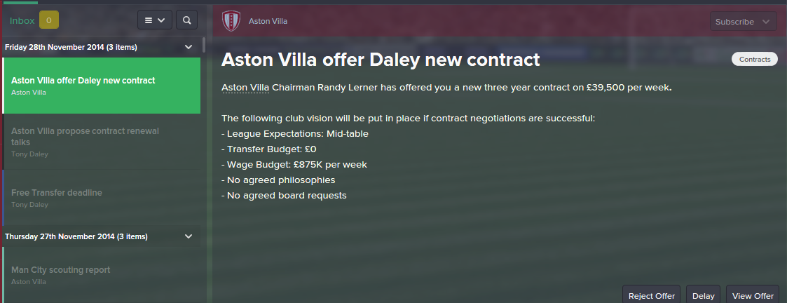 i have decided to accept the offer of aston villa and my contract now runs till 2018 so that clubs the club a bit of stability and relaxation for myself and the players, hopefully now we can kick on now and finish in the top ten"
