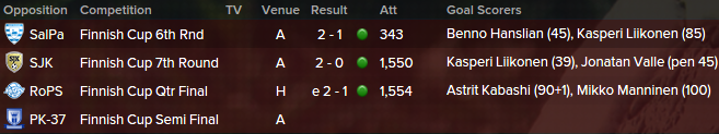"As I said before the season it would have been nice to finally win the Finnish Cup. It was not meant to be as HJK defeated us after extra time. This gives us more time to concentrate on the league though, hopefully we can take advantage." - Mr. Shroom