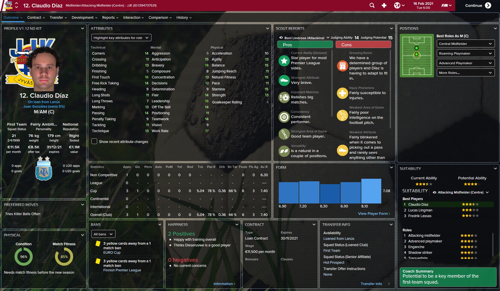 Claudio Diaz spent the whole 2020 season with JJK on loan from Lanus and has decided to continue his loan agreement for one more season. JJK were in ned of quality and depth in the midfield and Diaz was a sure choice after his decent showings last season.