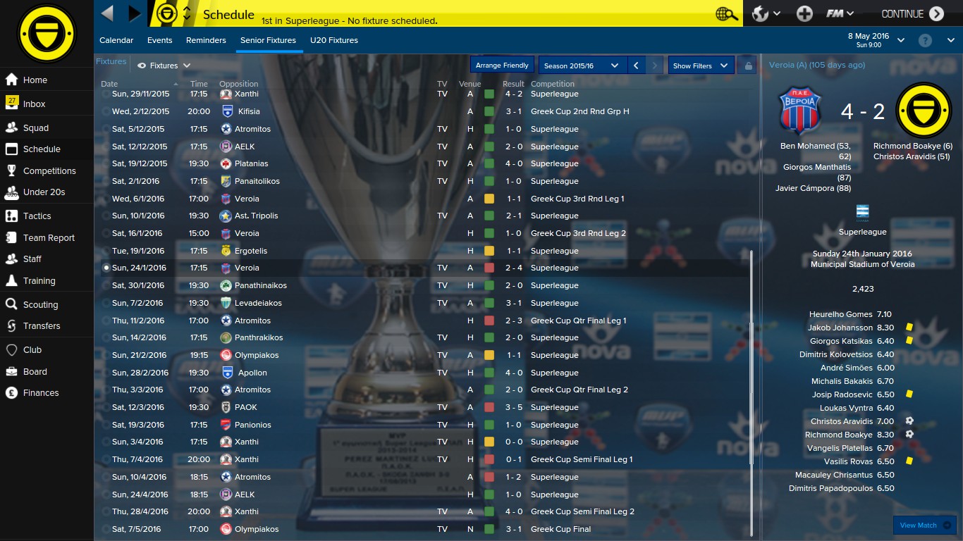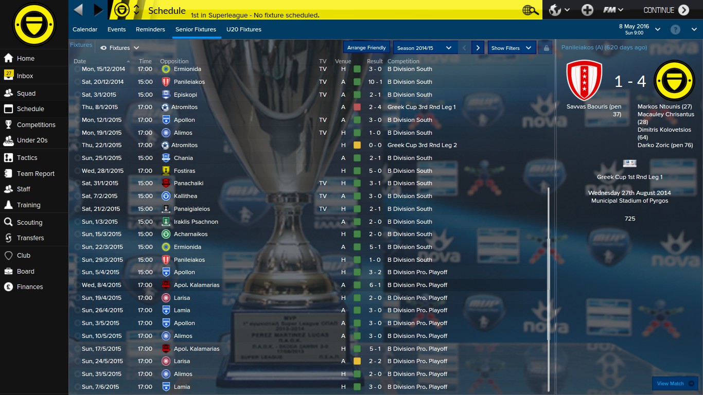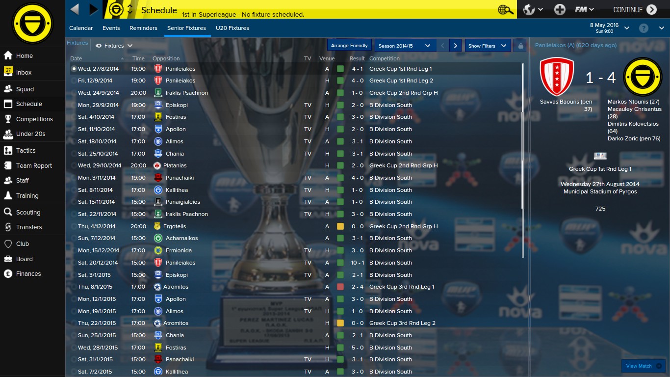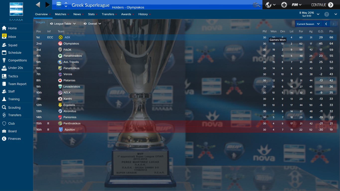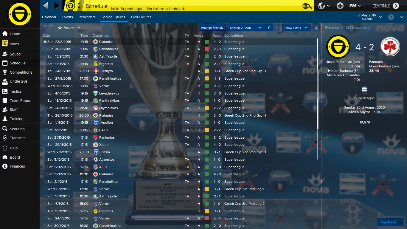 The board decided that to pay off the crippling debt that the club would drop to the 3rd division of Greek football striping them of there proffesional status making them a amature club. The club are now financially sound and are ready to make a big comeback. Can you be the man to spark the fallen giants to the Greek throne and unleash the sleeping giant within Athens.