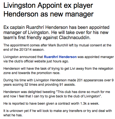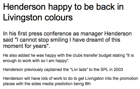 After a month off football he was signed by Scottish 3rd division side Livingston who were in their first season as Livingston F.C. who were formerly Meadowbank Thistle. During his time with Livi he made 201 appearances over 9 years scoring 52 times and gaining 91 assists an incredible record. Henderson's achievements with the The Amber Machine include Winning the Scottish League 3 in 1995/96, the Scottish 2nd division in 1998/99, in 2000/2001 the team completed the fairy tale winning Scottish First division and getting promoted to the Scottish Premiership, however on what Henderson maintains was his greatest achievement Livingston finished 3rd in their first season in the SPL. However the following season Livingston finished 9th in 2002/3 and Henderson considered leaving however he was convinced to stay by new manager Márcio Máxima. Although Livingston finished 9th once again the club lead by Henderson won their first cup completion winning the League Cup 2-0 over Hibernian. Henderson regards this as his best time in football and is still a fan favourite with Livi today. However with the club in financial trouble a move soon was agreed.