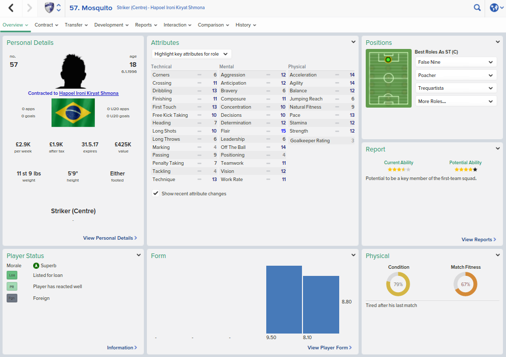 Brazilian Thiago Rodrigues da Silva or Mosquito as he prefers, joins Hapoel Ironi Kiryat Shmona on a free transfer from Atletico Paranense was confirmed shortly after he scored a hat-trick whilst on trial for the Israeli club against local side Ironi Tiberias. Manager Antonio Locatelli mentioned whilst talking about his qualities said that he could be loaned out due to the club already having 5 foreigners already registered.