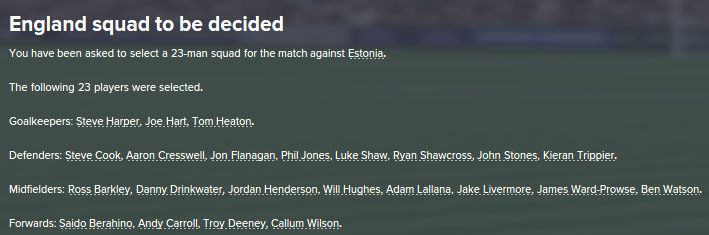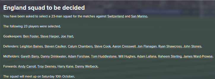 Steve Harper continues his great club form and is once again included in the squad, Adam Forshaw could make his debut whilst Jordan Henderson is dropped. Raheem Stirling and Harry Kane are brought back into the squad.