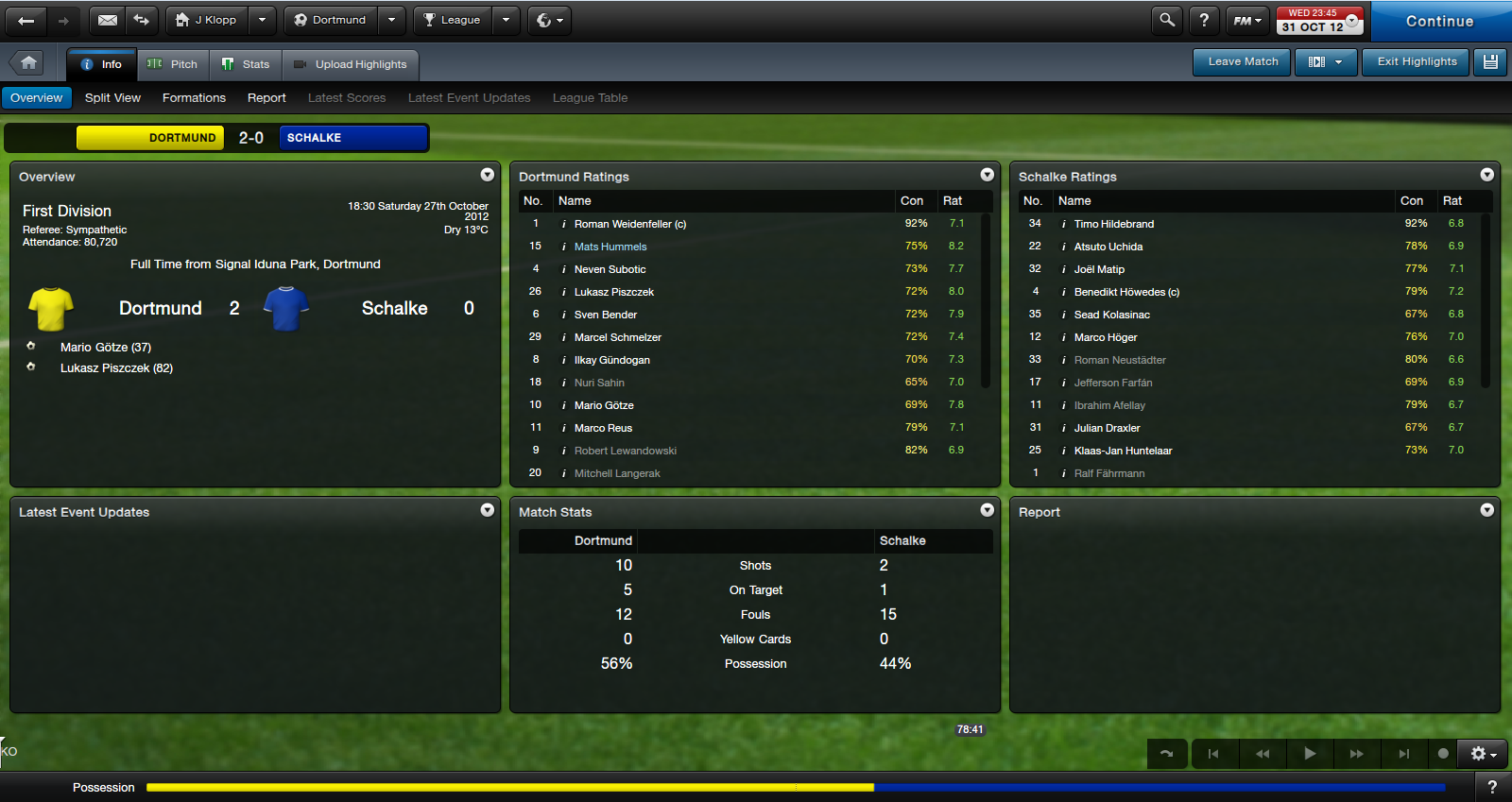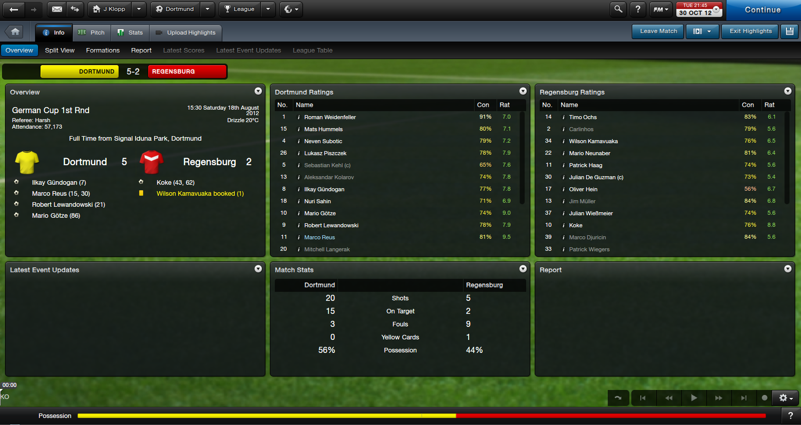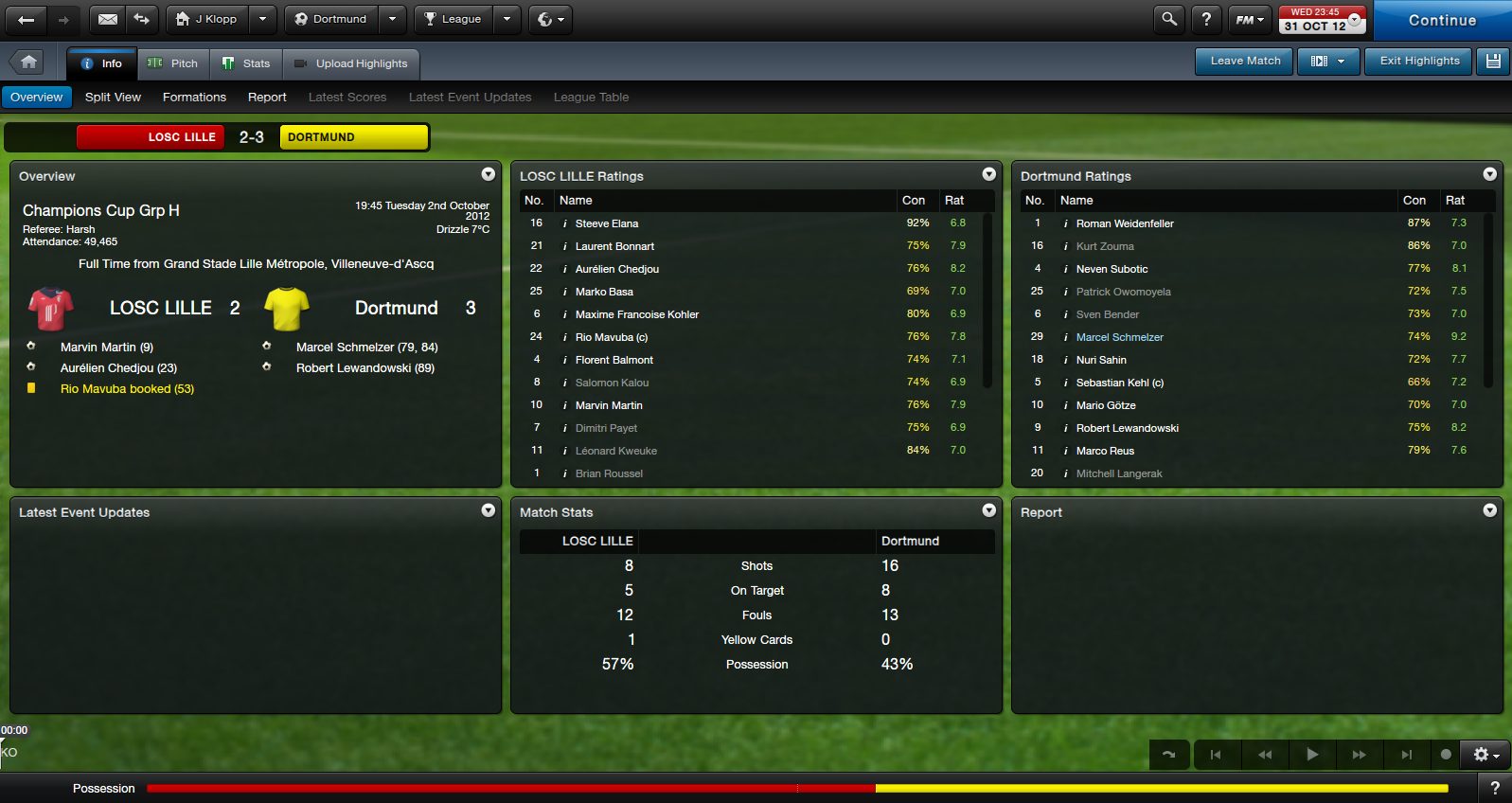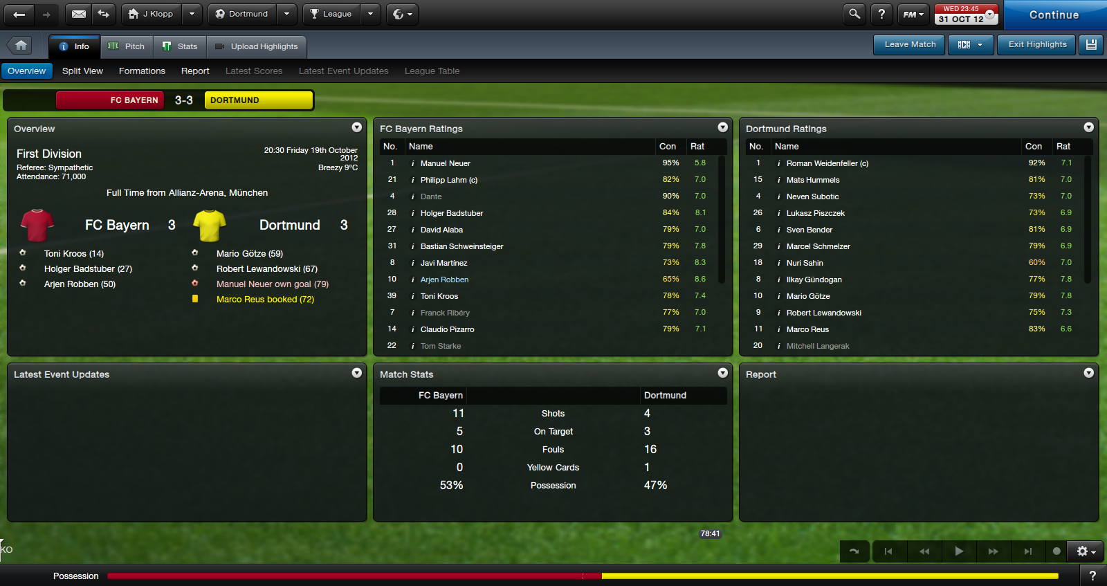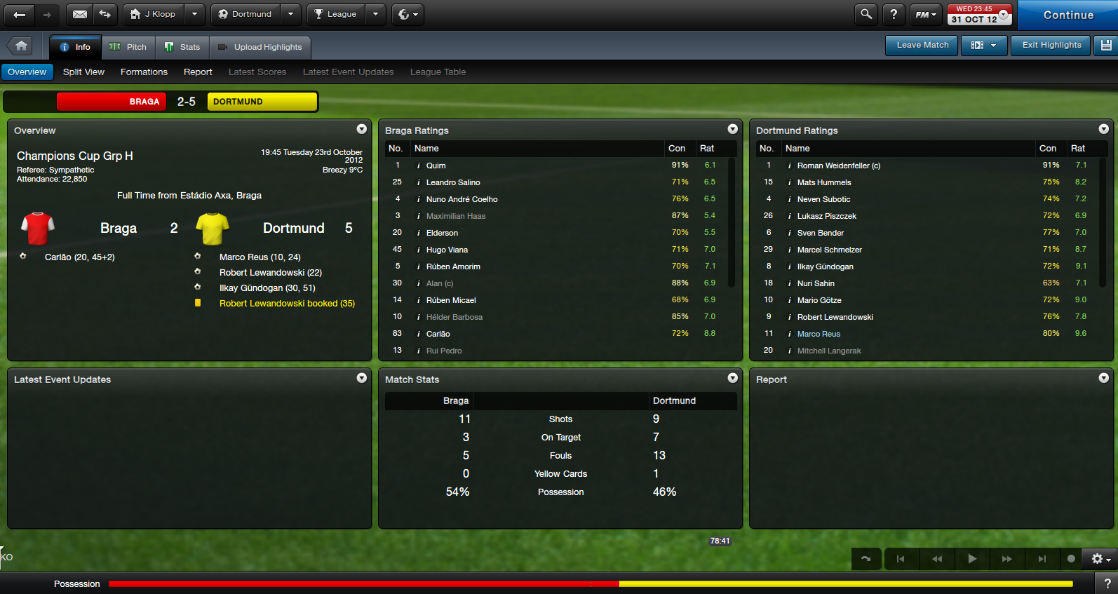 I would use the second team I support. Borussia Dortmund, at the time BVB had 'that trio' of Mario Gotze, Marco Reus and Robert Lewandowski. That season the Schwarzgelben also finished a way off the Bundesliga champs Bayern, 15 points to be exact, and of course reached the Champions League Final and were in the same group as City.