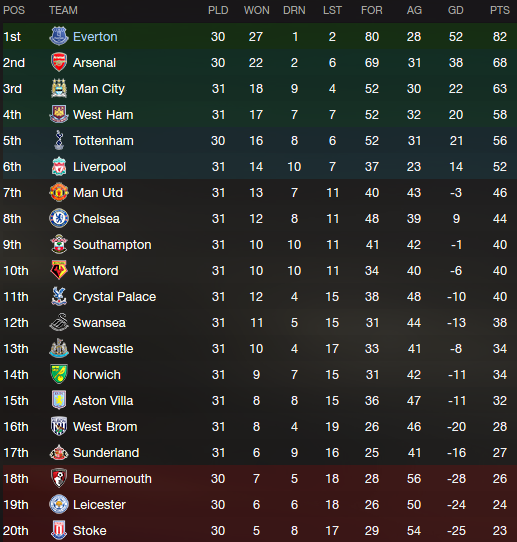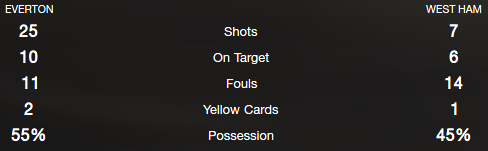 The game against West Ham was Everton's 5th game in 14 days having being taken to a replay by Manchester City in the FA Cup. Along with defeat with West Ham, that period has seen Everton defeat Man City, Southampton, Chelsea and QPR.