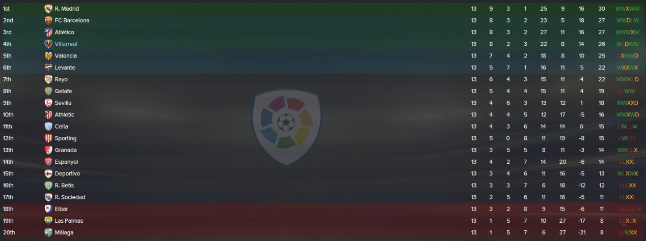 We managed to stay in 4th for November and whilst we extended our lead over the teams below 5th, we still have Valencia breathing down our necks. December is a huge month for us as we face not only a packed Christmas schedule, but also the climax of our Europa League group campaign, the beginning of our Copa De Rey conquest and big games against Real Madrid and Valencia at El Madrigal. As you can see Barcelona and Atletico lead us by a point, with Real Madrid top, but with the Club World Cup on the horizon for Los Cules the league could be about to take a dramatic twist...