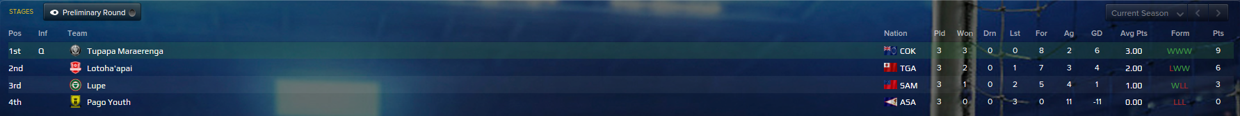 Before we go over the draw lets recap the preliminary round. On 1 January the four clubs of the preliminary round were drawn for their portion of the competition from 26-30 January. The four clubs Tupapa Maraenenga (COK), Lothoha’api (TGA), Lupe (SAM) and Pago Youth (ASA) were the teams chosen for this phase of the competition. Tupapa Maraenenga would be the winners of the phase with a 3-0-0 record.