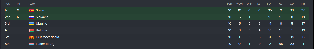 Going into the final four games of qualifying, Belorussian's knew they had to win all four games to stand any chance of qualifying and also hope that other results go their way. After a strong start, with massive wins against Luxembourg and Macedonia, Belarus went into games against 29th ranked Ukraine, in which they let a 2-1 lead slip, and ended up drawing 3-3, and a away tie against 18th ranked Slovakia, who in the end were just to strong for Belarus.